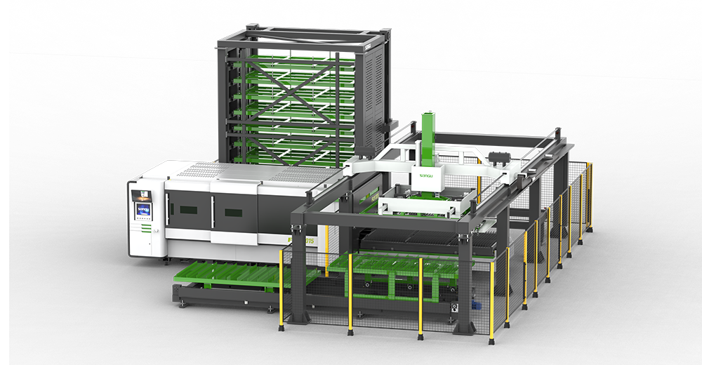 在松谷激光切割机的切割平台上搭载 HyStore 系列自动上下料及仓储系统,通过软件控制系统进行串(chuan)联控制,实现无人值守的全自动化智能(neng)激(ji)光切(qie)割生产线;